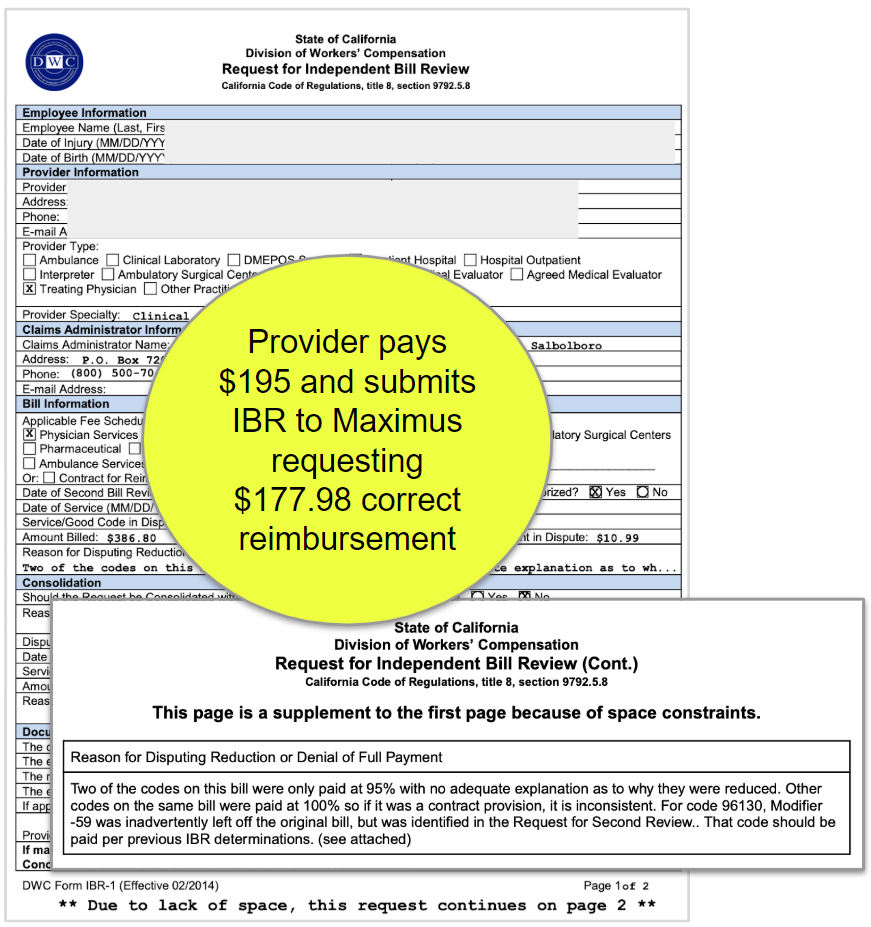 California’s current work comp regulations place the entire burden on providers to timely appeal incorrect payments. When a claims administrator refuses to pay the correct amount, the provider must timely submit a Second Review appeal, followed by an Independent Bill Review (IBR). The IBR entails sending complex paperwork to Maximus and paying a $195 filing fee, as well as sending a copy of the IBR to the claims administrator. If a provider fails to timely or compliantly submit these appeals for correct payment, the provider’s bill is dismissed by the claims administrator with no additional funds due to the provider.