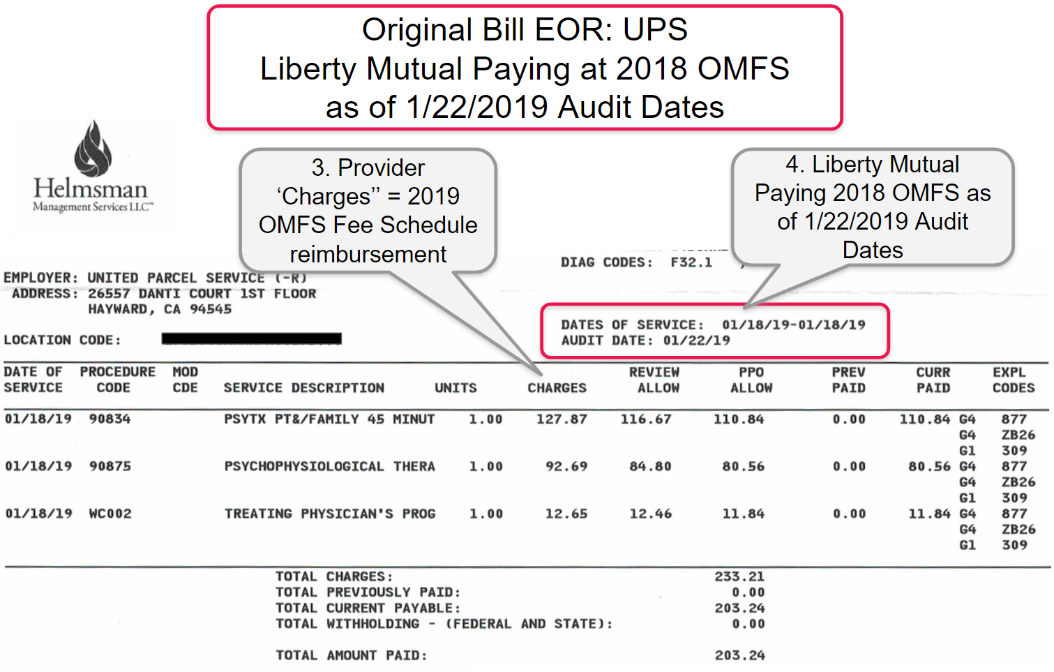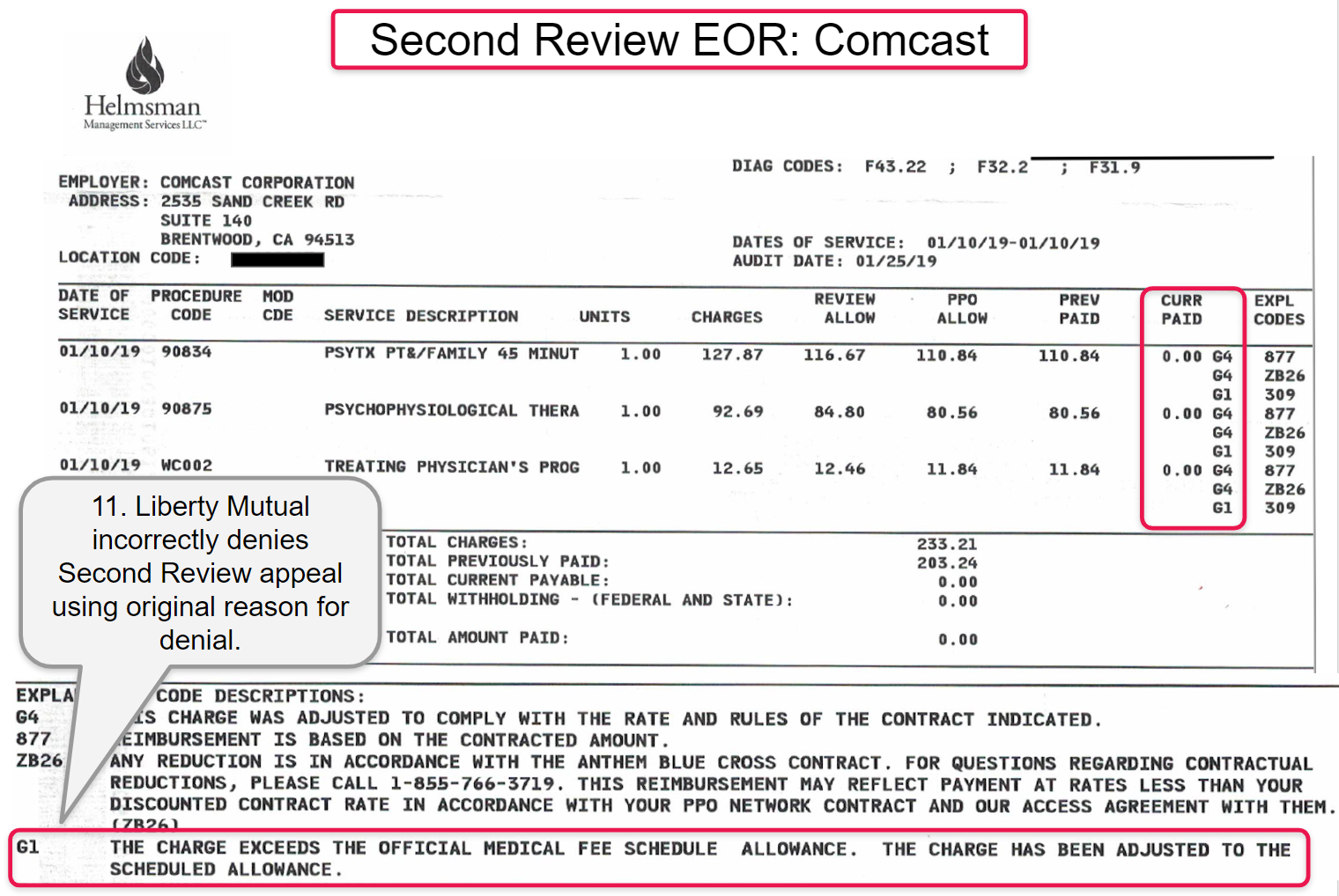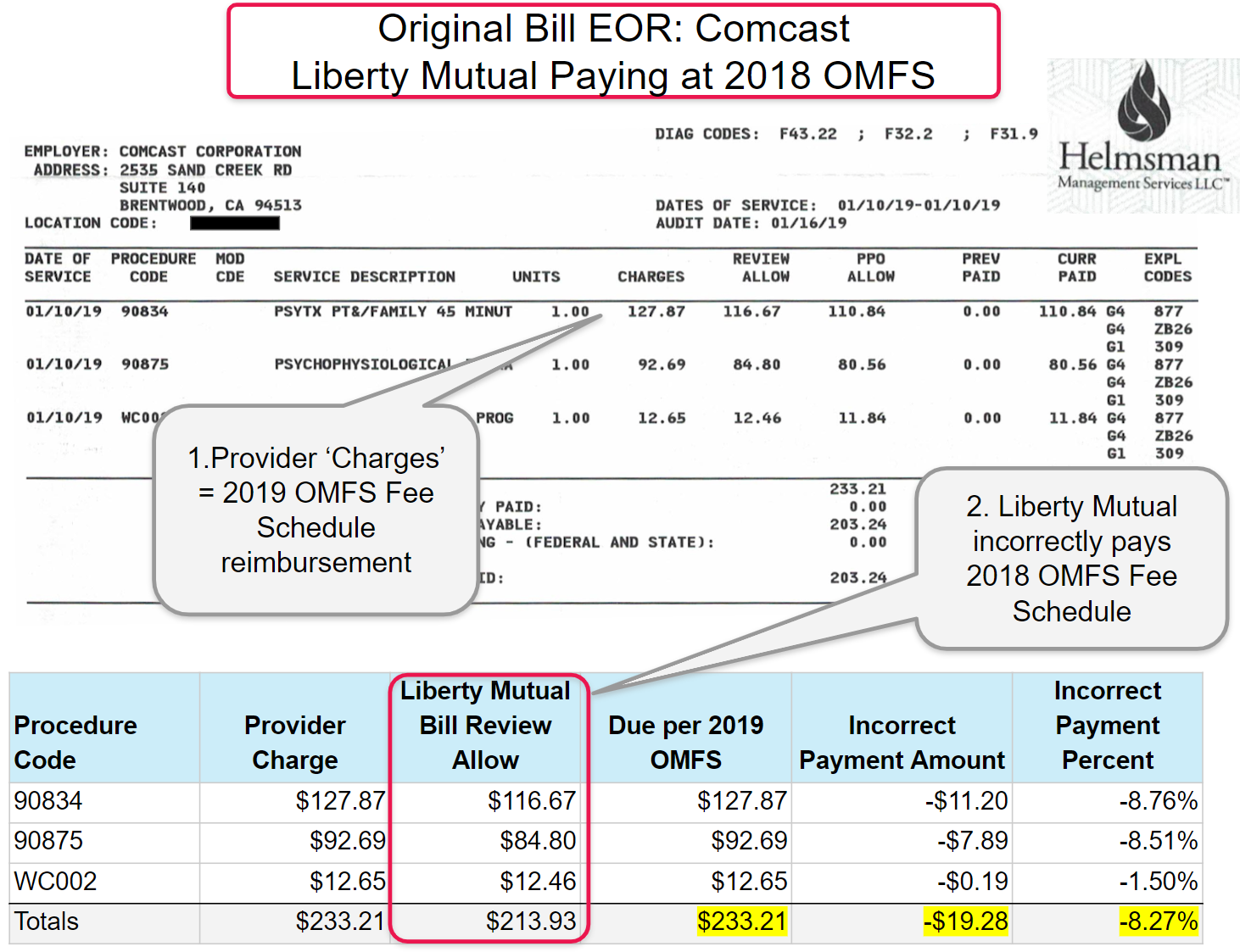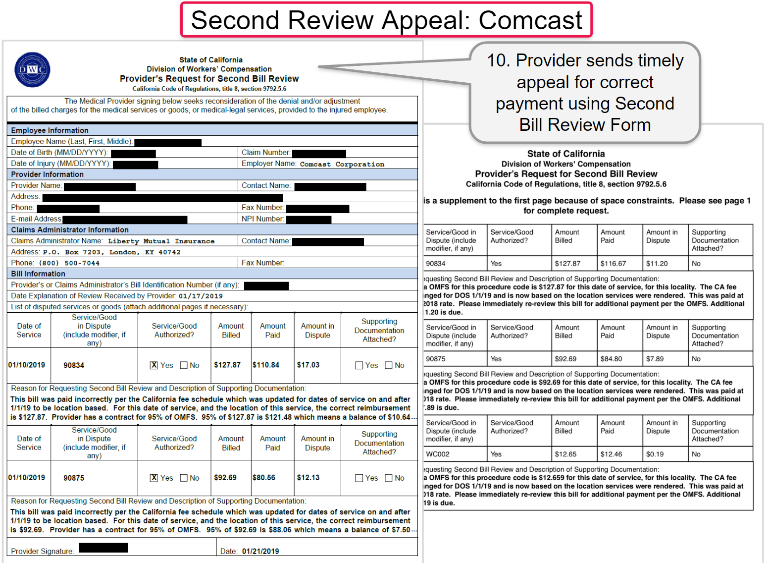 In the examples below, a provider submitted three original bills to Liberty Mutual. The billed charges submitted by the provider equaled the exact reimbursement due per the 2019 Physician Fee Schedule. Liberty Mutual incorrectly reimbursed all three original bills using the 2018 fee schedule, and subsequently Liberty Mutual incorrectly denied the provider’s three Second Review appeals.