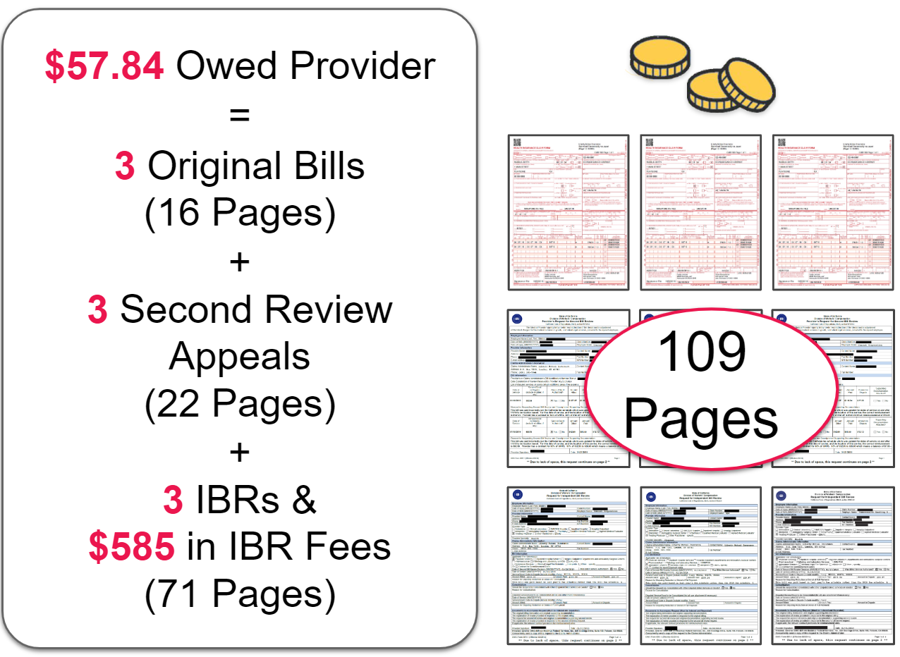Based on this example, and the previous examples of payment offenses by Sedgwick and York, providers should ask the DWC to address two issues: first, the systematic incorrect reimbursements by claims administrators; and second, the extraordinarily unfair burden that IBR places on providers who are simply trying to receive the correct reimbursement per the OMFS. As demonstrated below, providers cannot economically justify the expenses of the state-mandated appeal process and claims administrators are clearly incentivized to incorrectly reimburse providers that treat injured workers.