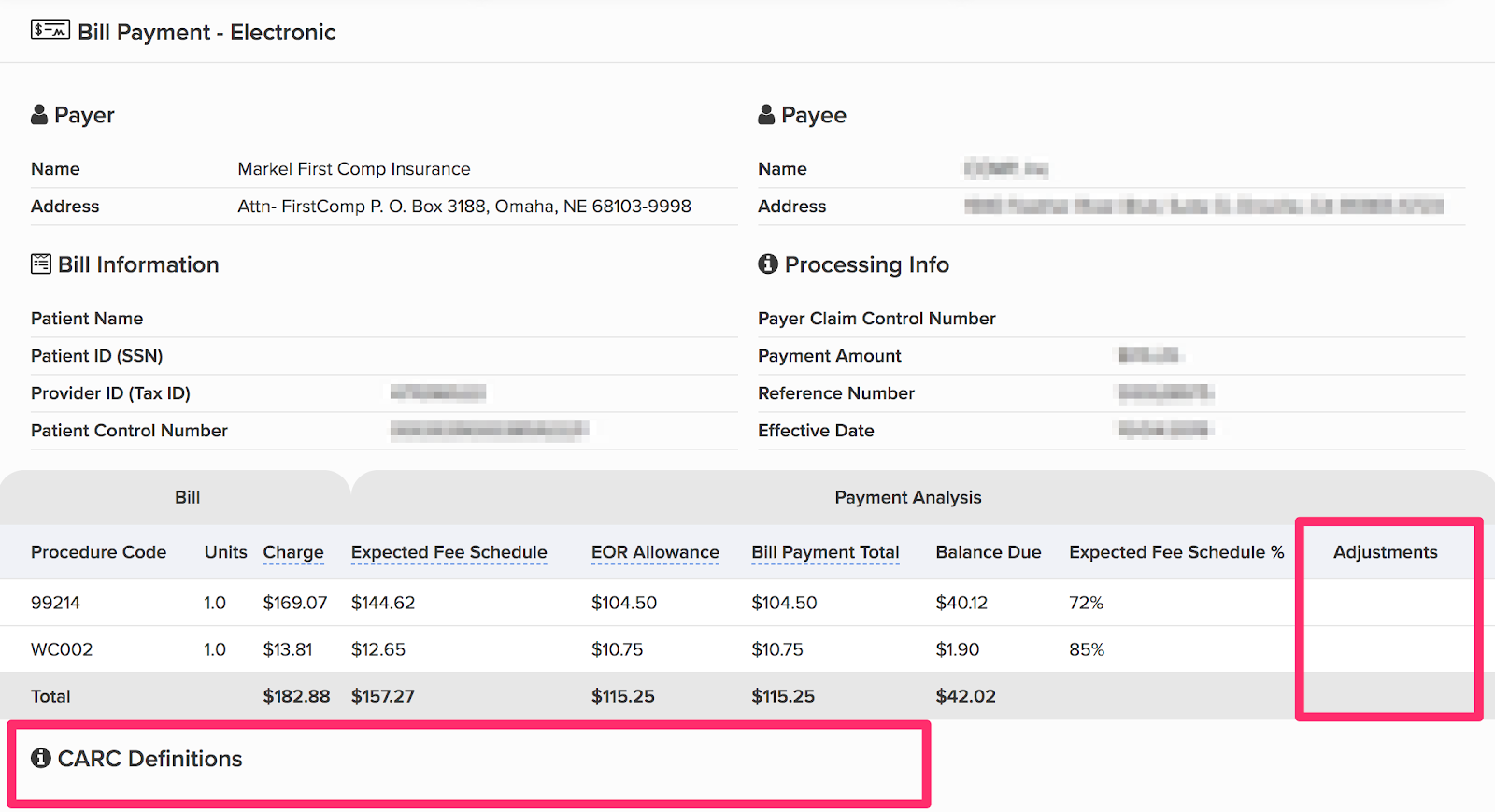 Electronic Explanations of Review (EORs) from Markel First and Midwest Insurance are missing crucial pieces of information. Key required elements like patient names and Social Security numbers are absent, as are details necessary to confirm proper reimbursements — like the adjustment codes meant to justify denials or reduced reimbursements.