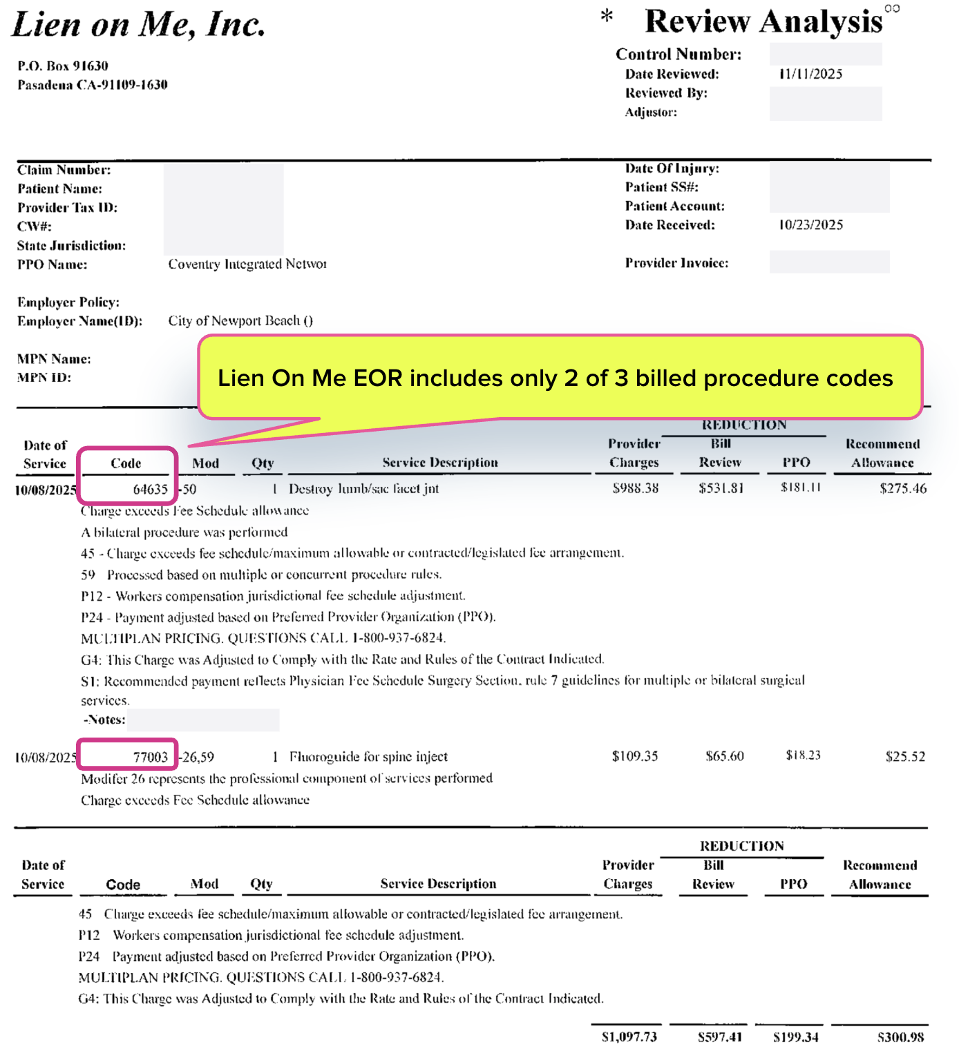 However, Lien On Me failed to properly process the doctor’s bill, which included three procedure codes that Adminsure authorized on behalf of the City of Newport Beach. The paper EOR from Lien on Me listed only two of the three billed procedure codes.