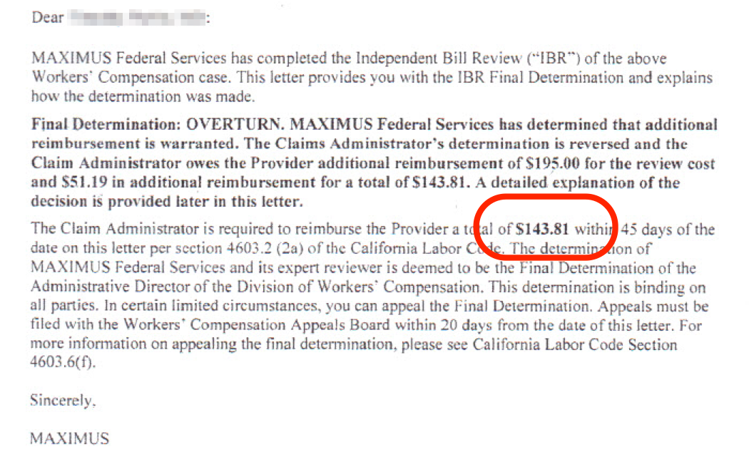 Maximus Federal Services, the entity responsible for conducting Independent Bill Review (IBR) on behalf of California’s Division of Workers’ Compensation (DWC), has once again demonstrated a level of incompetence to which only a brave few can aspire.