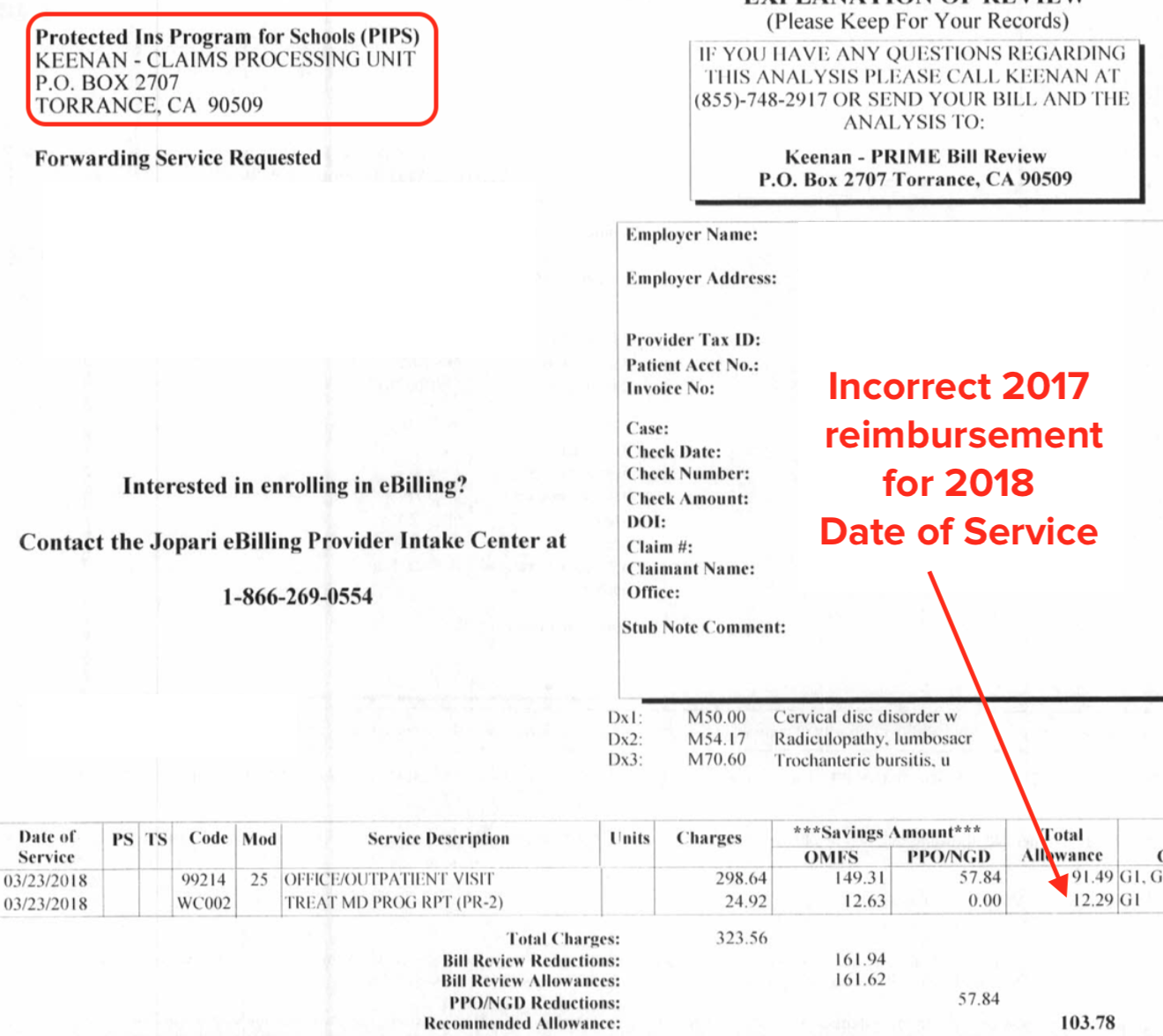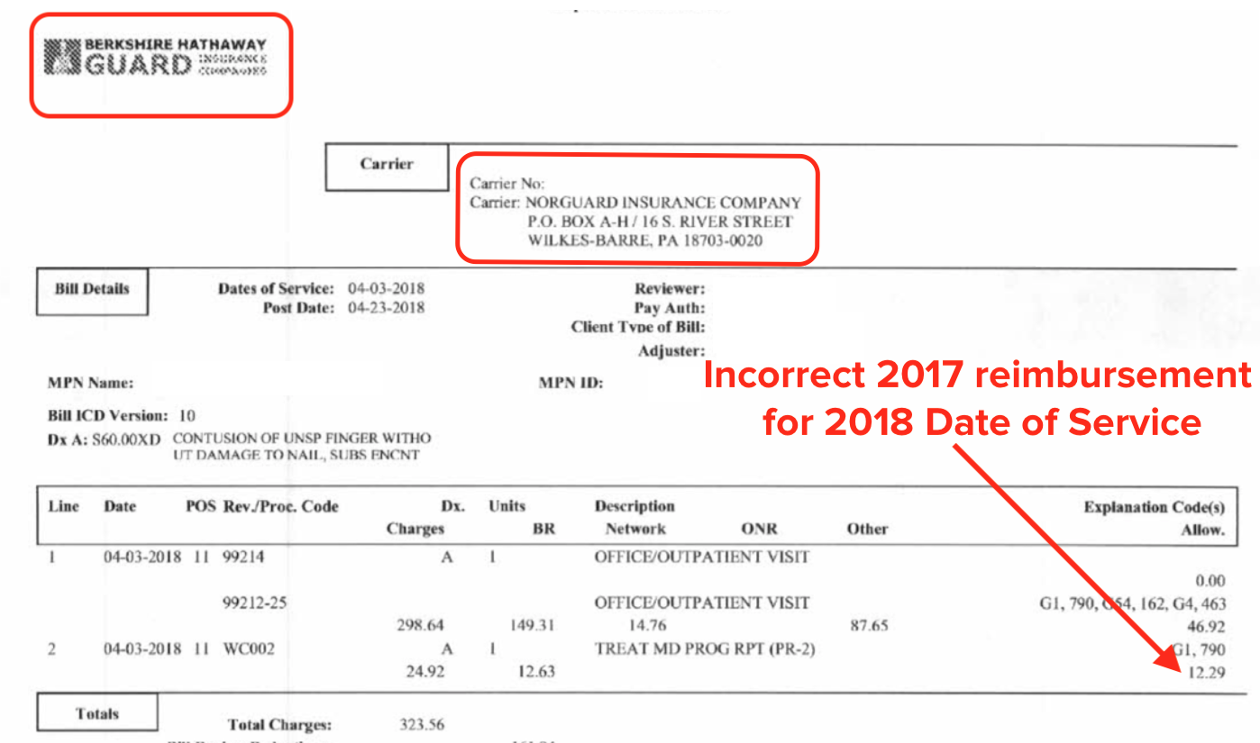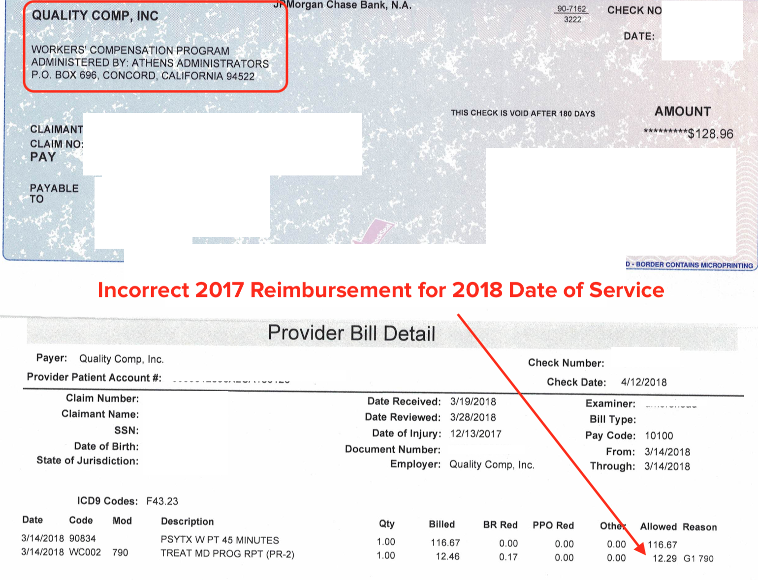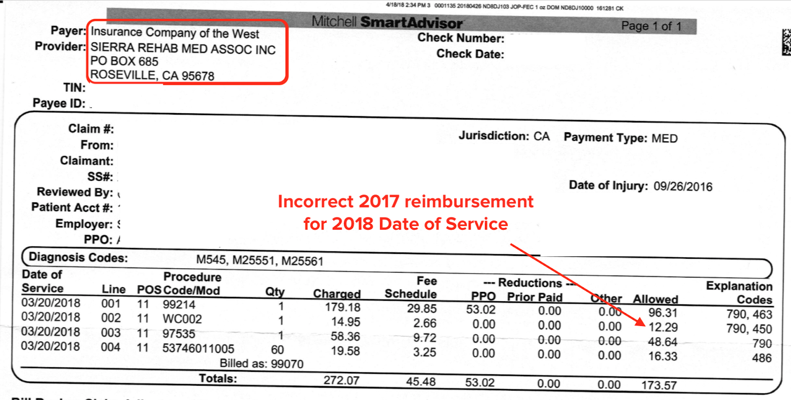 We’ve noticed this problem all year for various billing codes. We’ve called on claims administrators to update their systems to reflect California’s current Official Medical Fee Schedule (OMFS). Now, inexplicably, we see a particular code (WC002) paid at 2017 rates for 2018 dates of service — even as other codes on the same bill are paid correctly.