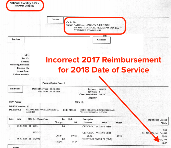 These claims administrators reimbursed providers for PR-2 reports at 2017’s rate of $12.29. While $0.17 may not seem like a reimbursement crisis at the level of an individual charge, these reports are among the most commonly issued in workers’ comp.