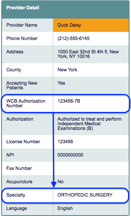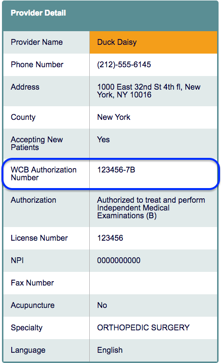 The “WCB Auth# “ is the WCB Authorization Number assigned by the New York WCB to all workers’ comp Authorized Providers. The WCB Health Care Provider Search portal lists this WCB Authorization Number for all authorized providers, as shown in the example below: