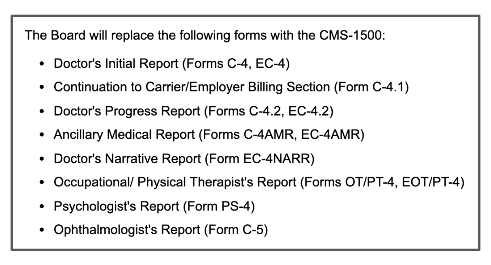 The WCB is letting go of the past as it moves to phase out other forms and formats. New York will set aside as many as 12 other forms, including the oft-used (and much-maligned) Initial, Progress, and Narrative reports. As the state makes room for its relationship with the CMS-1500 to flourish, one thing is quite clear: this engagement makes life much easier for providers, patients, and billers alike.