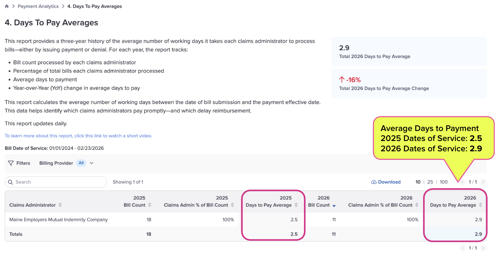 Since then, the practice has submitted 29 e-bills and received reimbursements with exceptional turnaround times. For claims with 2025 dates of service, the average payment speed was 2.5 days; for those with 2026 dates of service, the current average is 2.9 days.