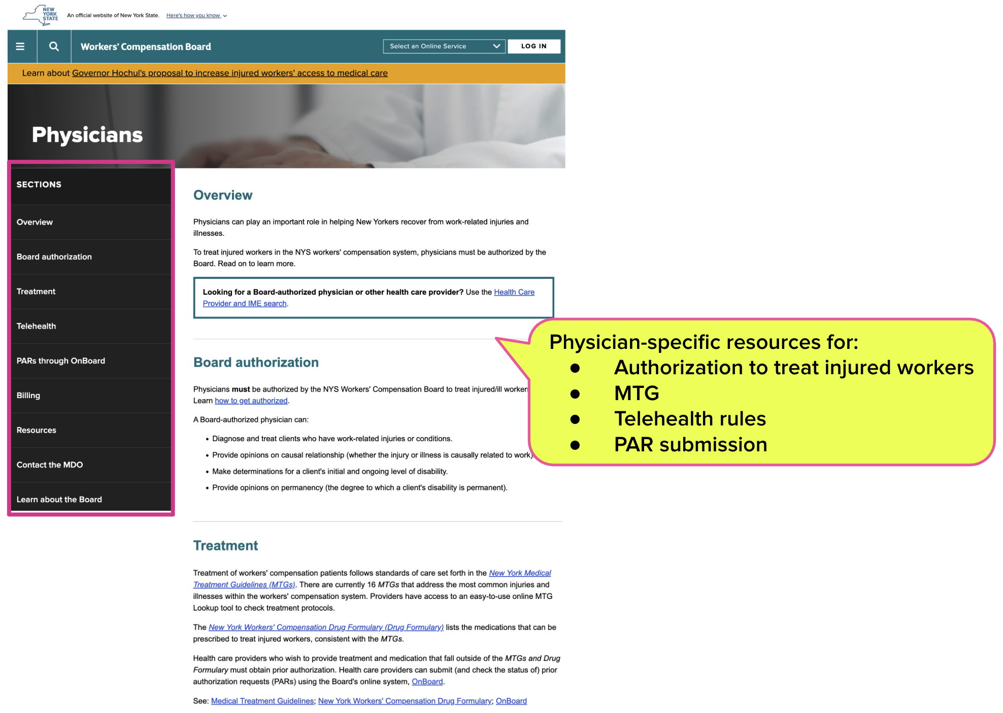 Clicking any provider type opens a page (e.g., the Physician page below) with further links to resources for multiple aspects of participating in the workers’ comp system, including: