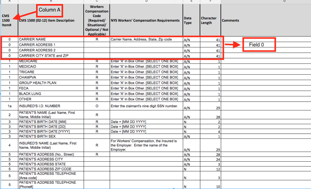 Column A identifies the corresponding field on the CMS 1500 form. The subsequent columns provide instructions on completing each field. For example, the red box below highlights the instructions for field ‘0’.