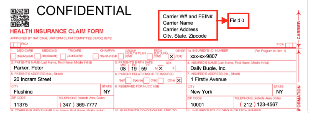 The CMS-1500 Initiative webpage also provides a sample of a properly completed CMS 1500. Below, all of the information listed for Field 0 appears in the red box.