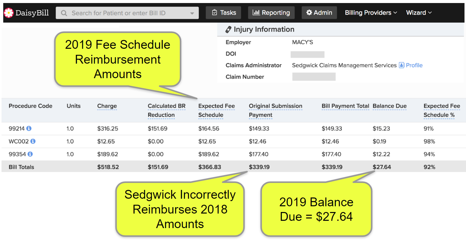 We called about a bill for the employer Macy’s. It was another instance where Sedgwick incorrectly reimbursed a 2019 DOS using the 2018 fee schedule. This resulted in Sedgwick underpaying the provider by $27.94, which represents an approximately 8% underpayment. Details of the incorrect Sedgwick reimbursement below: