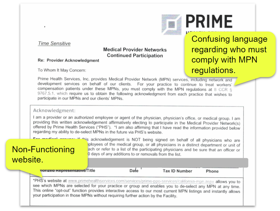 PHS sent the provider two documents. One was an offer to work within a Medical Provider Network (MPN), nominally a group of providers to which employers send their injured workers. The other was a contract to affiliate with a Preferred Provider Organization (PPO), a group of providers who accept reduced reimbursements, theoretically in exchange for more patients.
