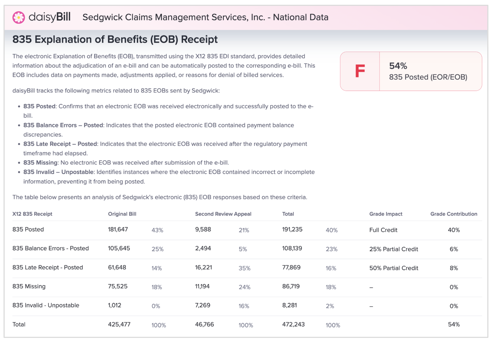 Over the past 365 days, daisyBill's data shows that only 40% of Sedgwick's e-EOR responses earned full credit (meaning they were received electronically, posted successfully, and arrived on time). The other 60% broke down as follows: