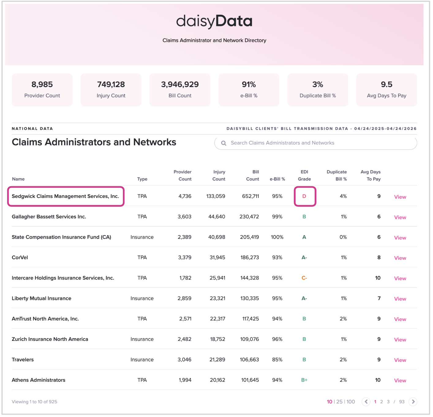On our Claims Administrator and Network Directory, daisyBill publishes EDI Grades for every payer to which daisyBill clients submit e-bills.