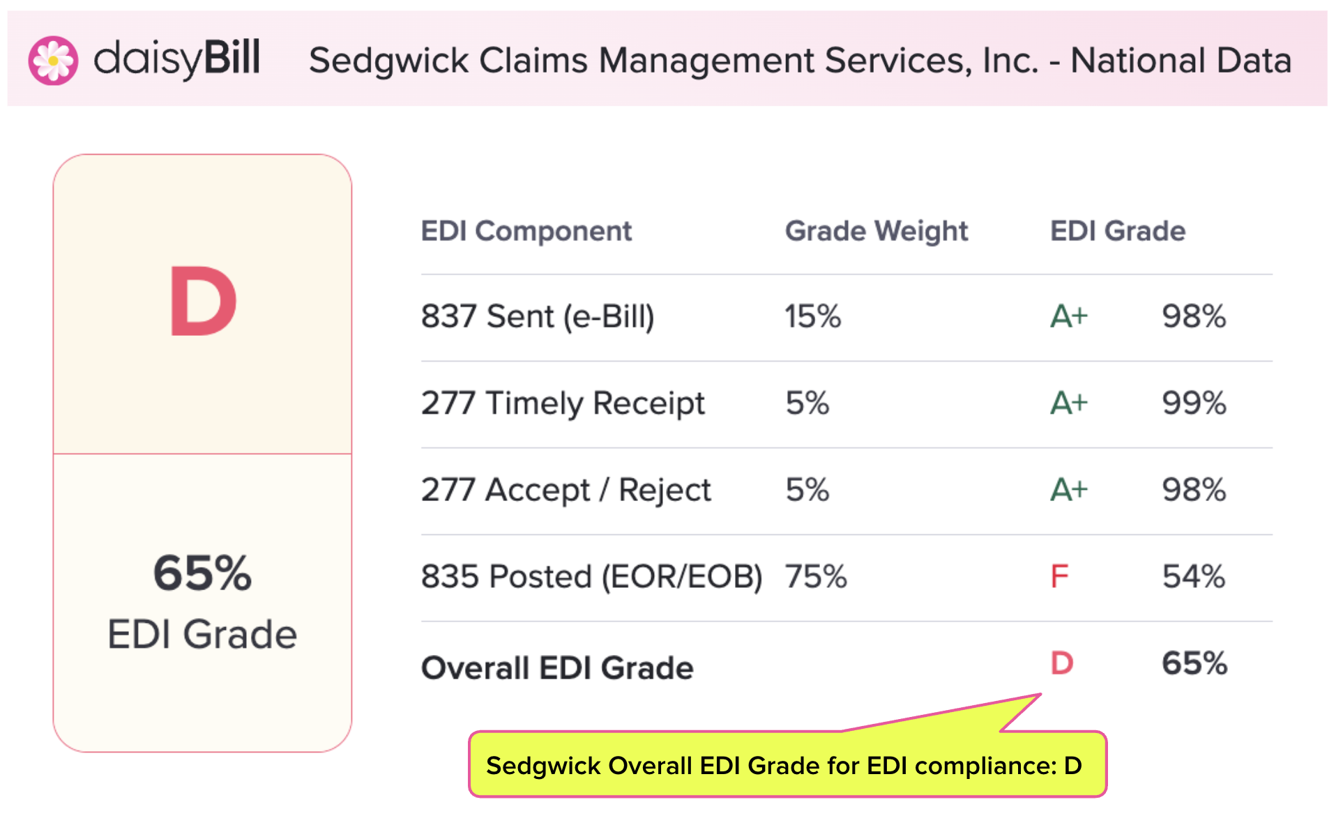 On daisyBill's Claims Administrator Directory, Sedgwick earns a D for EDI compliance — dead last among major TPAs and insurers.