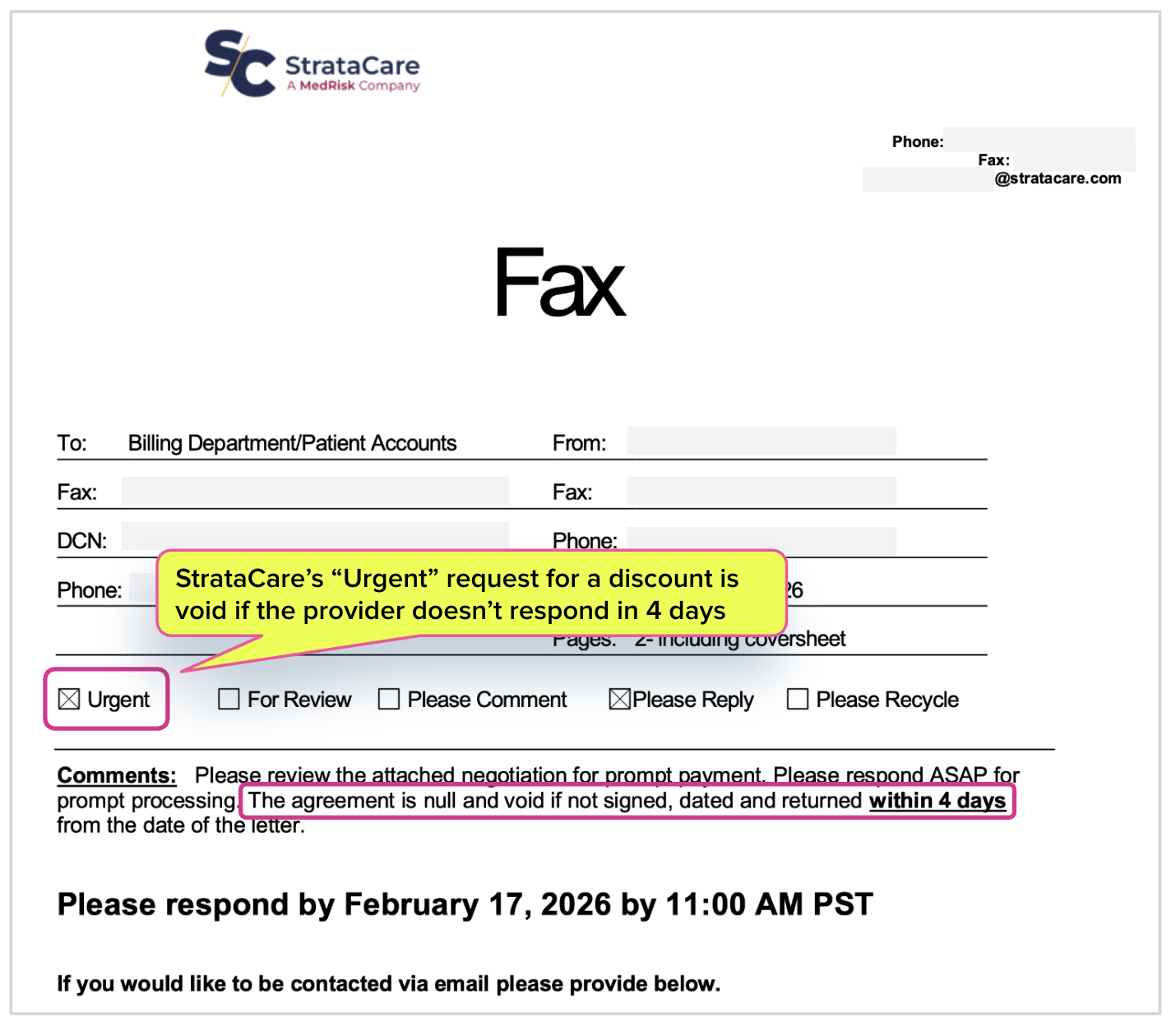 The letter even specifies an exact time (11:00 AM PST) at which the offer expires, as if StrataCare would ever say “no” to a provider willing to give away their reimbursements, regardless of any artificial deadlines.