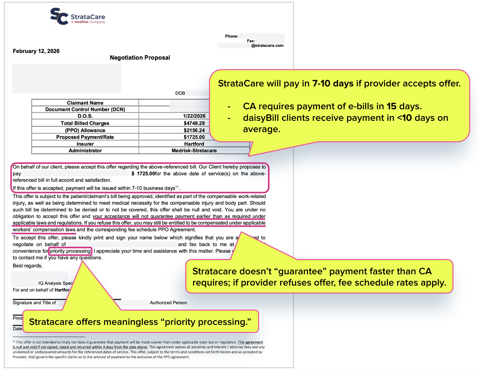 In response to a bill the practice sent to insurer The Hartford, StrataCare offered the practice $1,725.00 for treatment that costs $2,395.81 under the Physician Fee Schedule. The only vague semblance of an incentive: “priority processing” and a promise (which StrataCare retracts in the fine print) that “payment will be issued within 7-10 business days.”