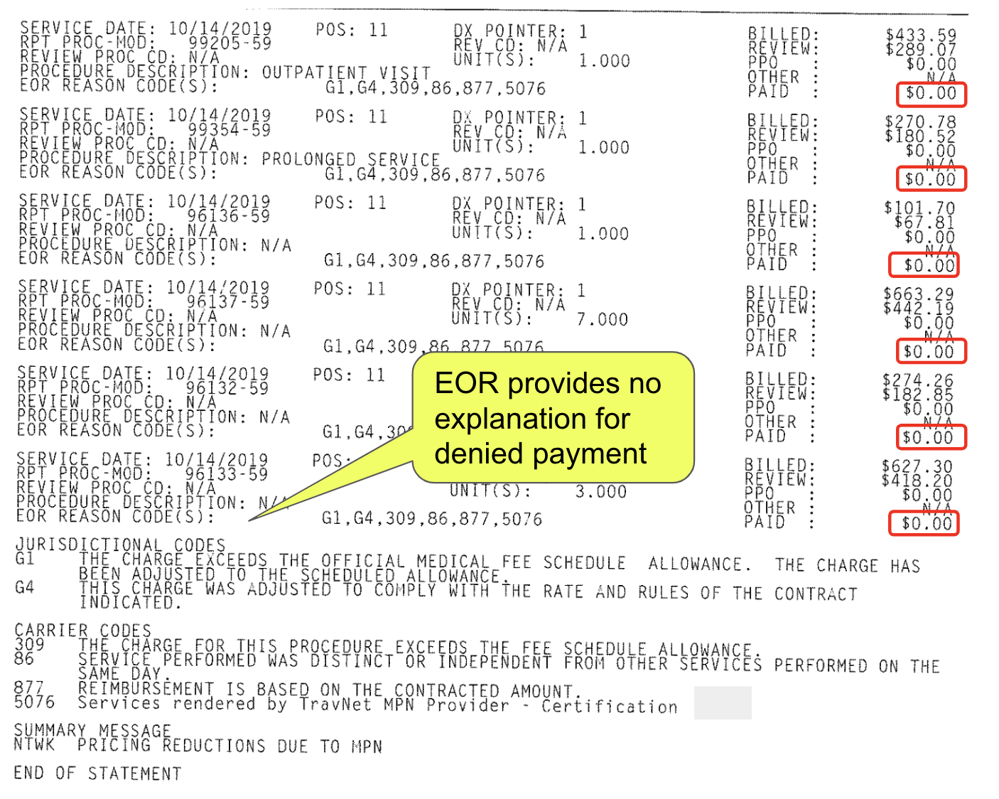 The provider obtained authorization for the treatment, submitted a compliant bill, received a nonsensical EOR from Travelers, and subsequently spent hours trying to determine the reason for nonpayment. Follow along as we trace each step in an increasingly infuriating and baffling reimbursement chronicle: