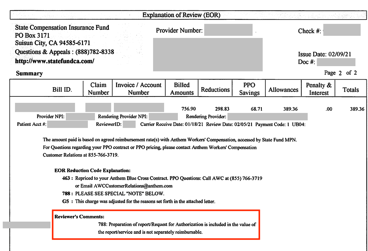 In another EOR for the same provider, SCIF asserts that “Preparation of report...is included in the value of the report/service and is not separately reimbursable.”
