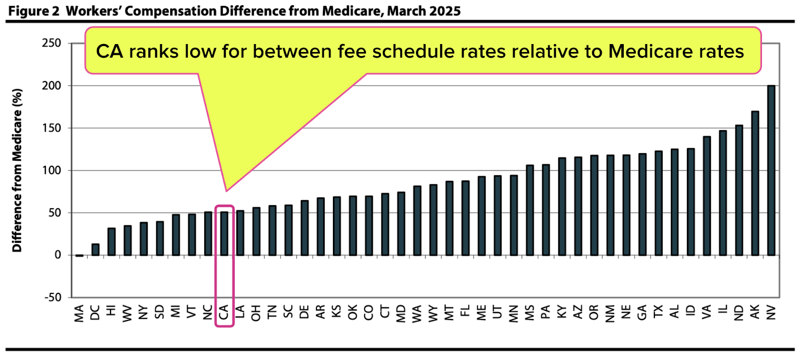 Again, the WCRI found no correlation between provider expenses and higher reimbursement rates, noting that “jurisdictions” with the high provider expenses, including California, also had low fee schedule reimbursement rates.