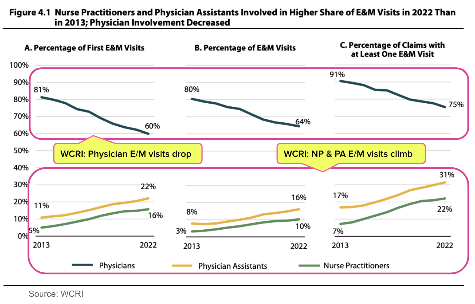 Using workers’ comp E&M data from 2013-2022, the study asserts an increasing reliance on non-physicians, which the WCRI attributes to a shrinking physician pool.