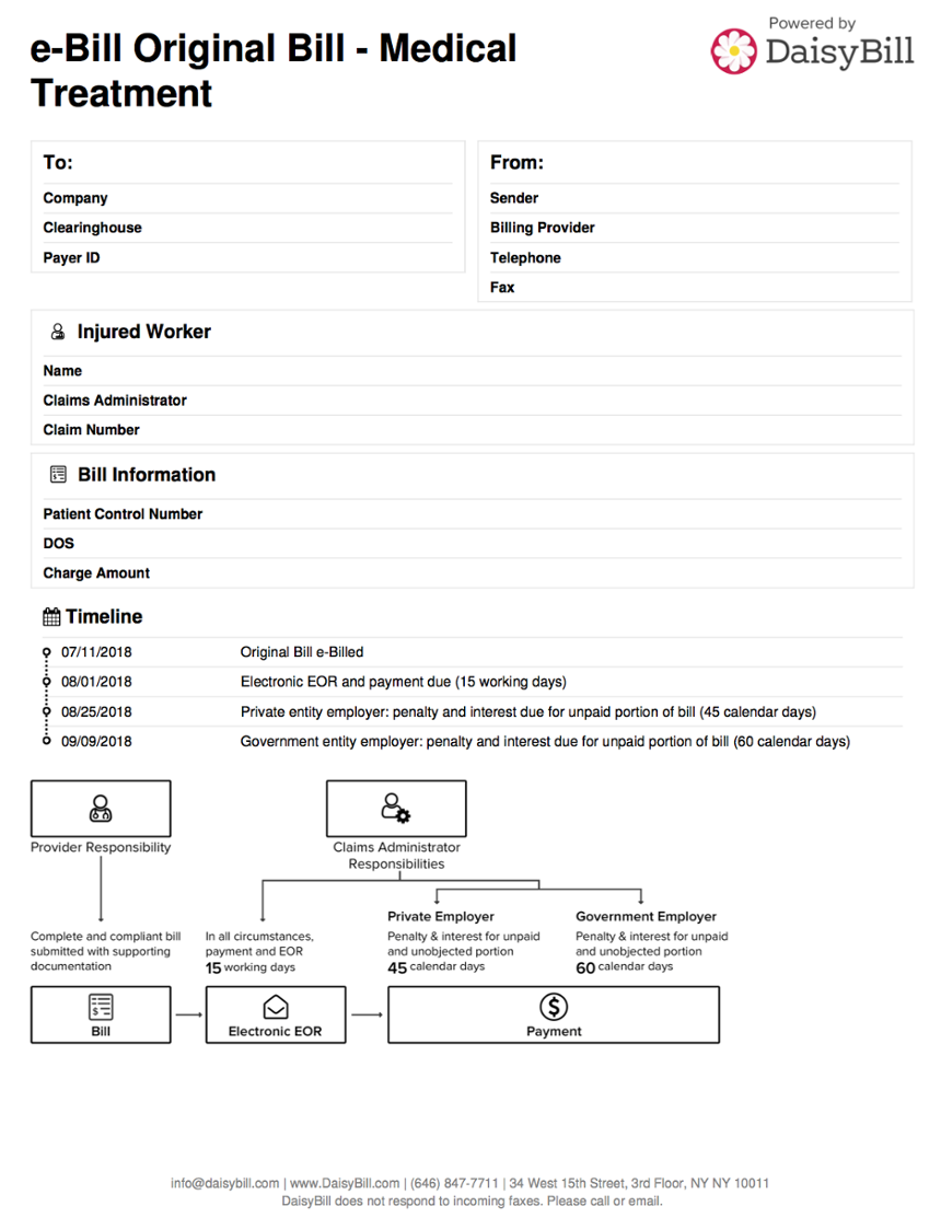 Regarding the last point, our cover sheet includes a complete timeline for the bill in question, providing exact due dates for the acknowledgment, Explanation of Review (EOR), payment, and any other applicable responses. There’s even a handy workflow chart of claims administrator responsibilities.