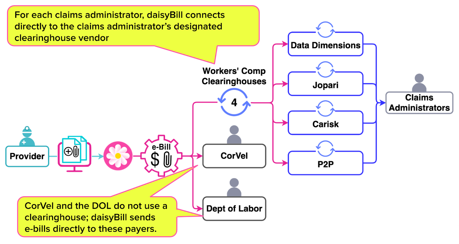 Note that CorVel and the Department of Labor (DOL) are the only two claims administrators that do not use a clearinghouse vendor. As these entities accept e-bills directly from providers, daisyBill maintains direct e-billing connections to both.