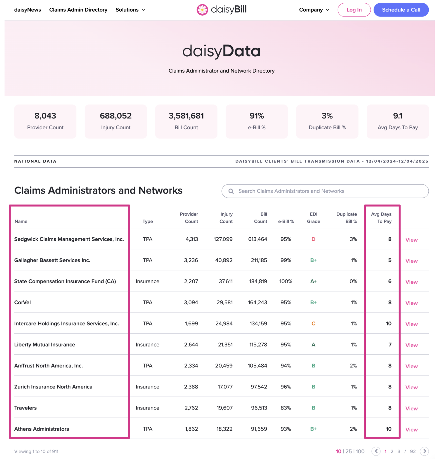 In our Claims Administrator and Network Directory, daisyBill tracks and reports payment speeds and compliance data for all claims administrators in our system on a rolling 365-day timeframe.