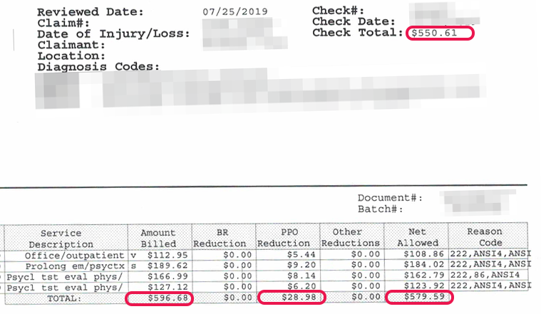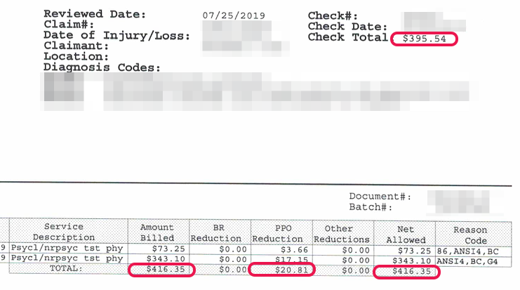 In this second example, York returned an EOR that displayed PPO reductions for each line item, but misstated the total “Net Allowed” by omitting those reductions. The check total, of course, reflects the incorrectly reduced reimbursement slashed by the PPO discount.