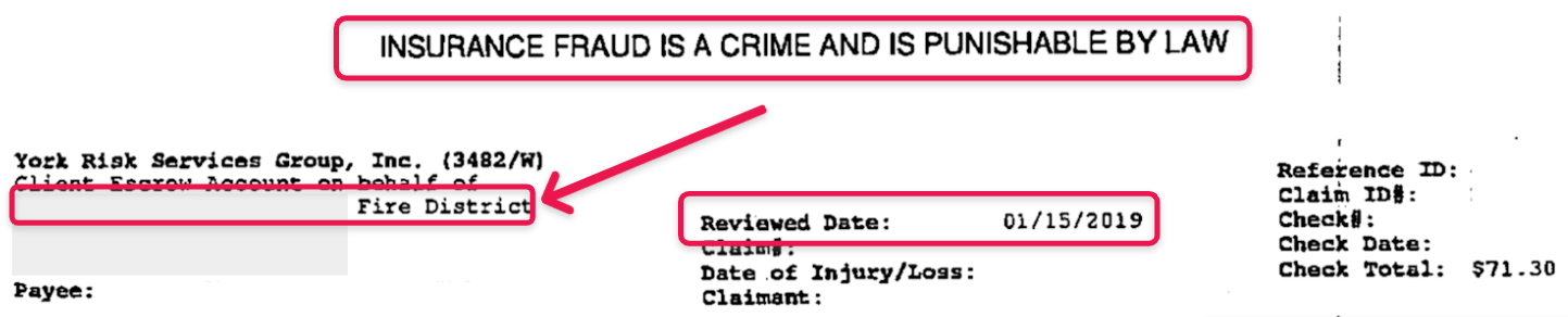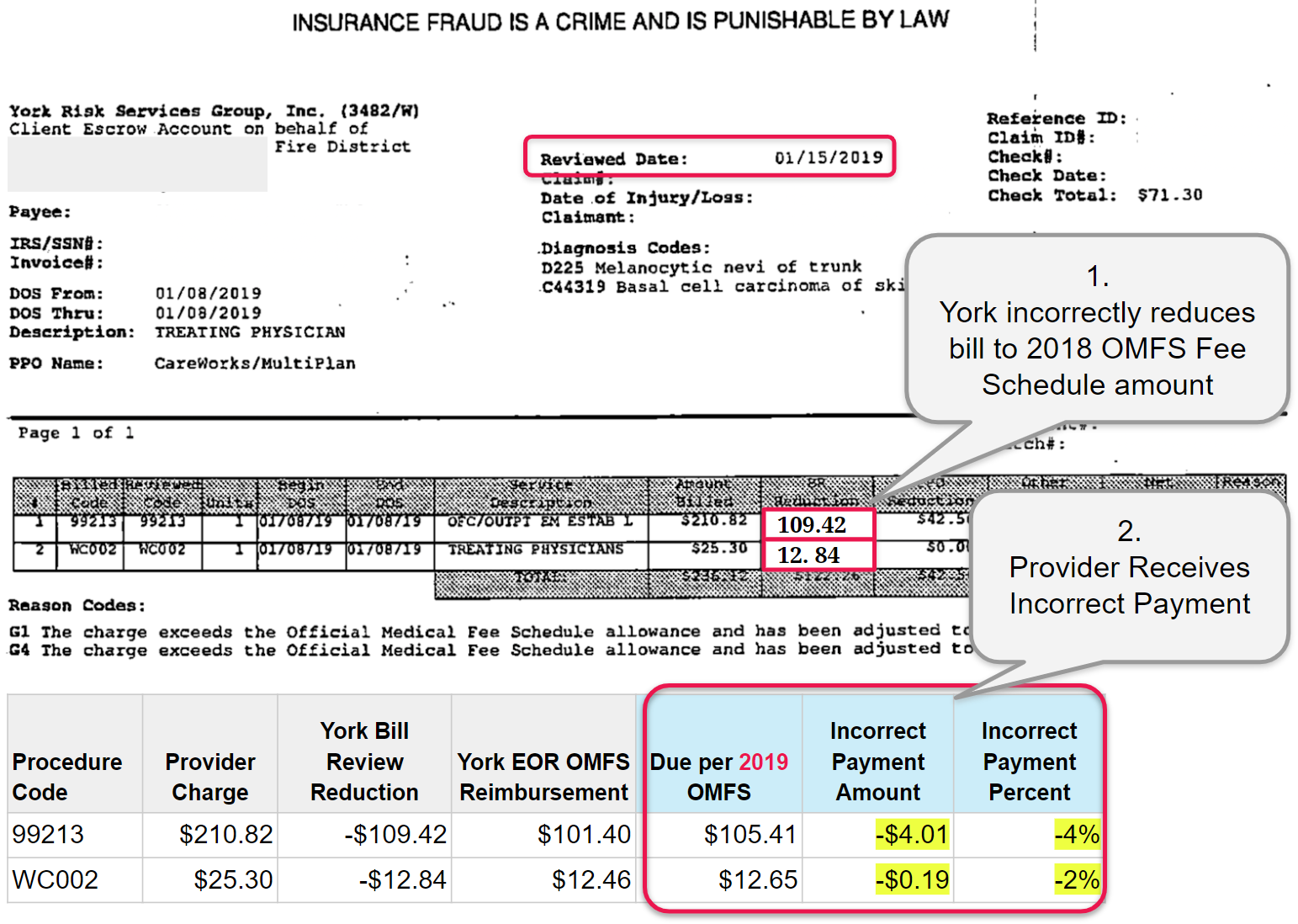 In this incorrect reimbursement example, York informs the provider that “Insurance Fraud Is A Crime And Is Punishable By Law.” York should heed its own warning. Given that there are many, many similar examples of incorrect reimbursement, York could be construed as engaging in a pattern of incorrectly reimbursing providers that treat injured workers.