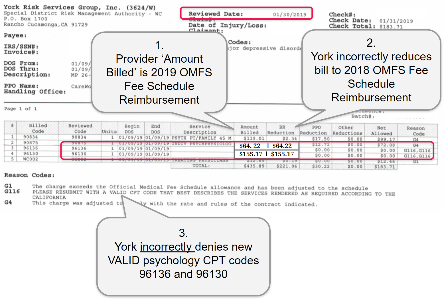 Despite the vastly increased complexity of the California Physician Fee Schedule in 2019, most administrators are abiding by the changes and issuing checks for the appropriate amounts. A few stragglers remain who, for whatever reason, fail to follow the new schedule. Today, we turn our attention to York Risk Services.