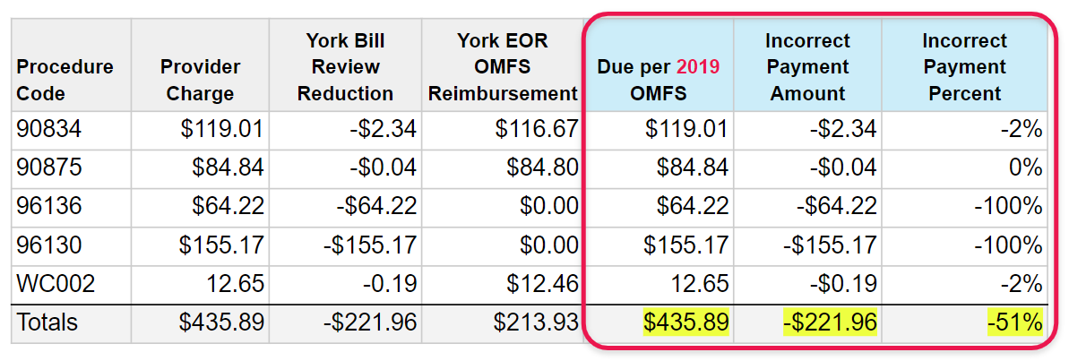 As we illustrated in our coverage of Sedgwick’s misapplication of the 2018 OMFS rates to 2019 dates of service (DOS), providers should not be burdened with correcting a claims administrator’s epidemic of incorrect reimbursements. DaisyBillers have already submitted 4,137 bills to York for 2019 DOS, and unfortunately, the bills with a York “Reviewed Date” prior to 1/30/2019 indicate a systemic, month-long error. York needs to step in and offer a solution to providers.