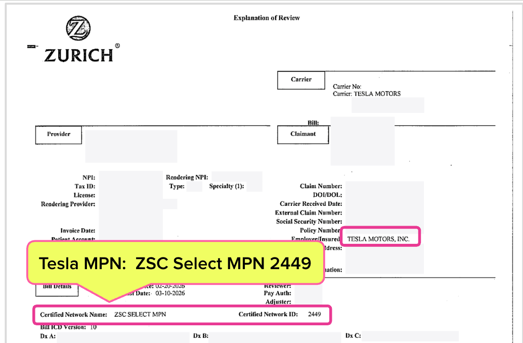 Zurich issued the EOR below in response to the provider's bill for treating the injured Tesla employee. The EOR indicates that Zurich restricts this Tesla worker to the "ZSC SELECT MPN" with MPN ID number 2449.