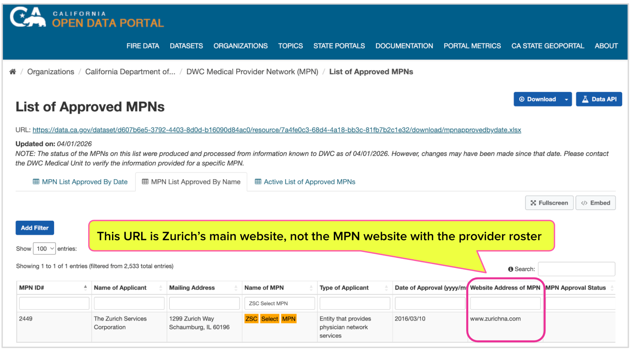 In theory, providers can confirm that an MPN applies and that they are a member by looking the MPN up on the CA DWC MPN list. As shown below, the ZSC Select MPN is indeed an active MPN under ID number 2449.